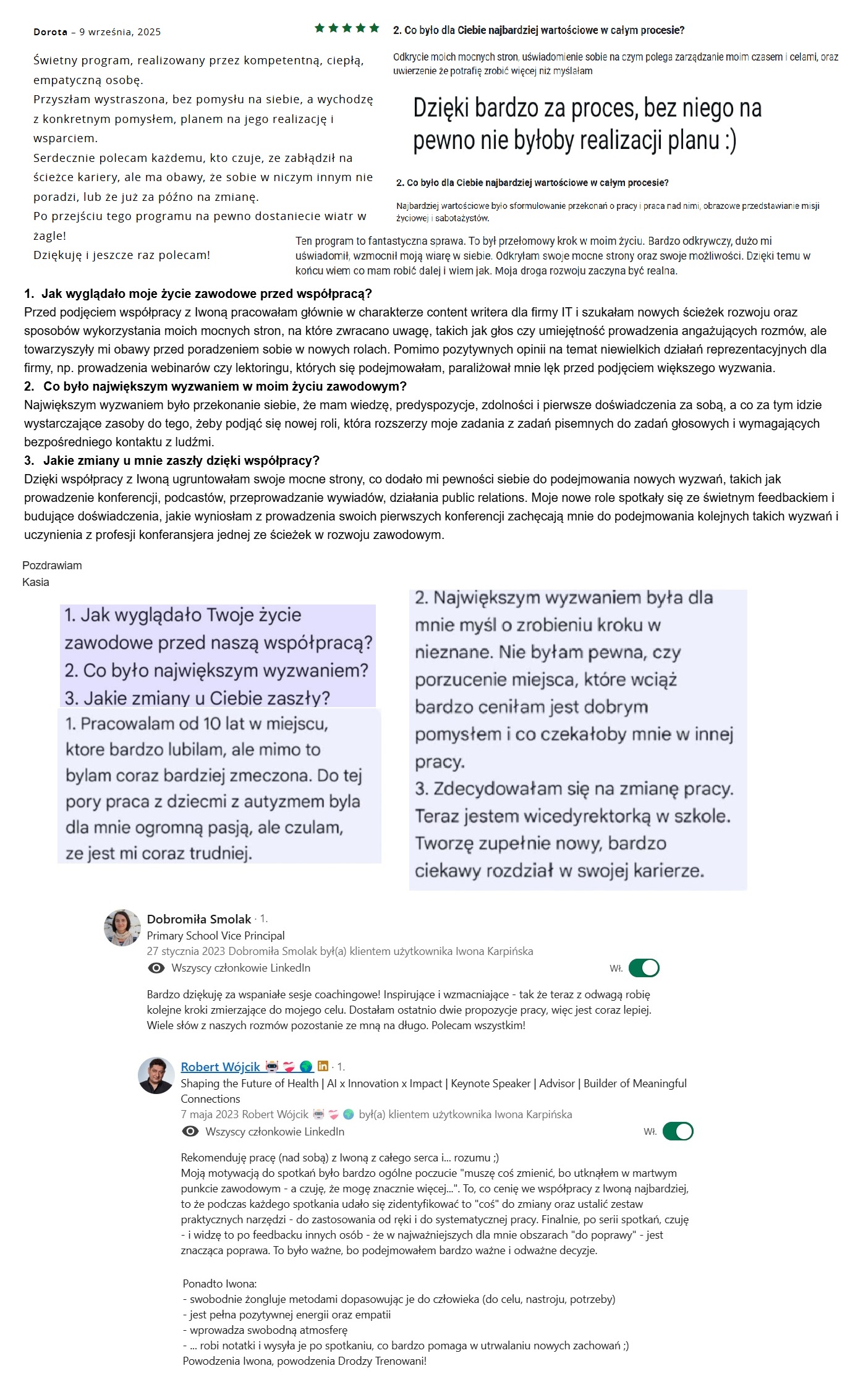 Nie ma idealnego momentu na zmianę zawodową. Z mojego doświadczenia wynika, że osoby, które odkładają decyzję „na później”, rzadko kiedy później faktycznie podejmują działanie lub wdrażają zmiany. Jeśli przez lata nie zrobiłaś kroku w stronę zmiany, trudno będzie zrobić go samodzielnie – dlatego warto skorzystać z wsparcia teraz. Zainwestowanie w transformację zawodową to decyzja o tym, jak chcesz kształtować swoją karierę – świadomie, w zgodzie ze sobą i swoimi talentami.