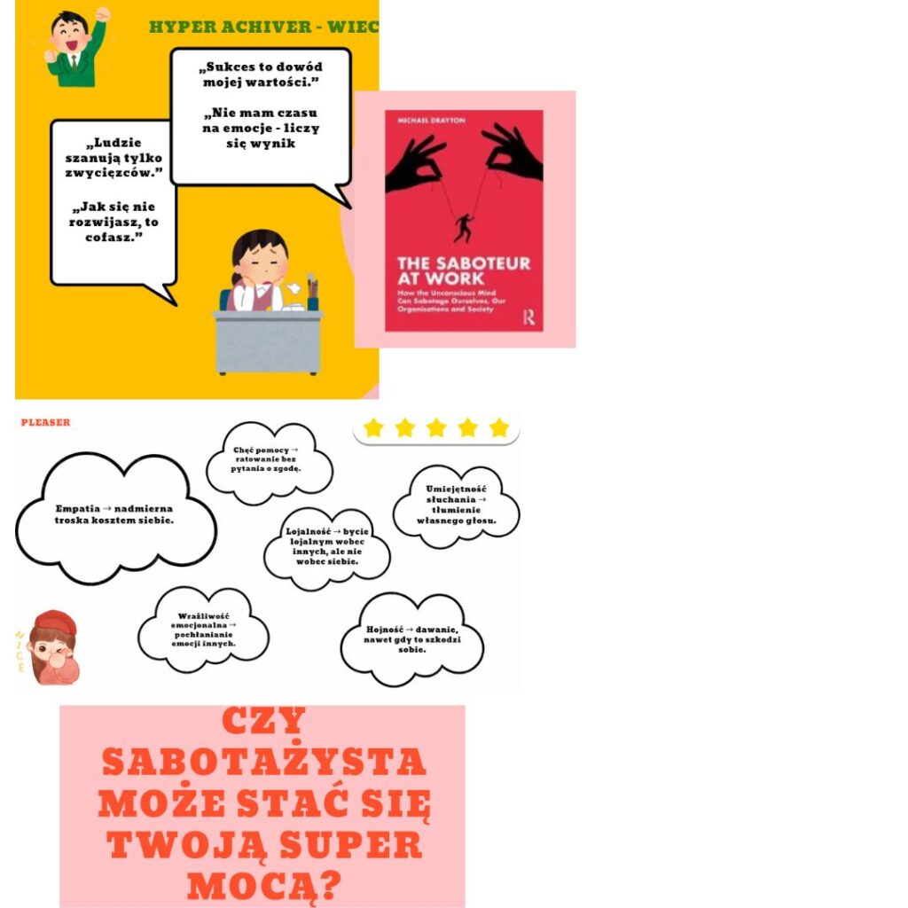 ✅ jakie są najczęstsze postacie sabotażystów – m.in. Krytyk, Perfekcjonista, Usprawiedliwiacz, Kontroler, Unikacz, Zadowalacz, Nadmierny Osiągacz,