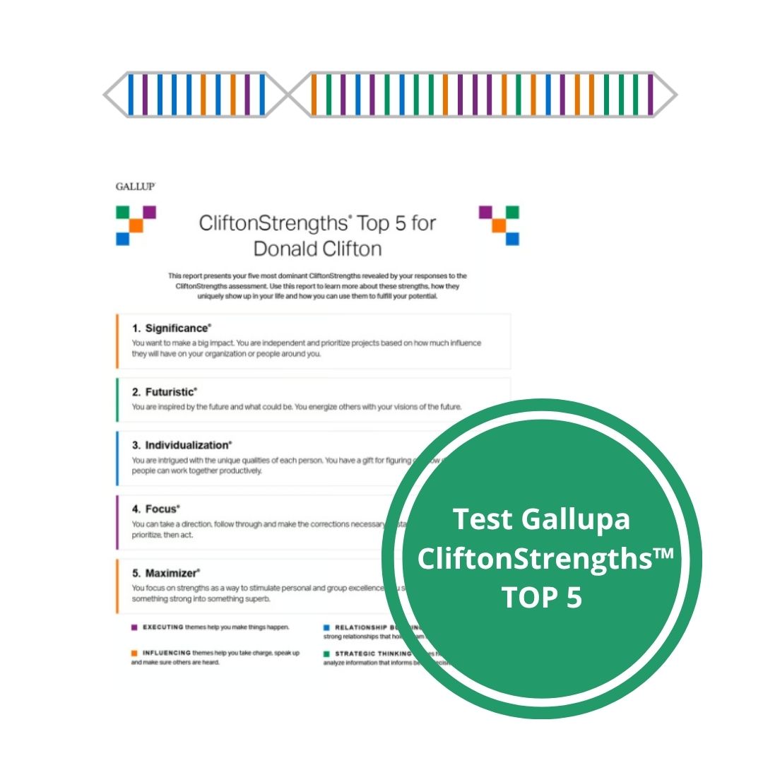 Wybierając test Gallupa Top 5 CliftonStrengths, otrzymujesz: