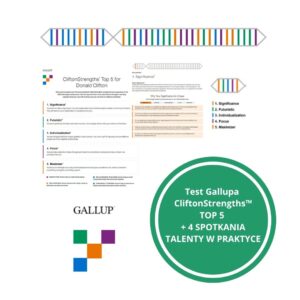 Odkryj swoje 5 dominujących talentów i naucz się je wykorzystywać w pracy, projektach i relacjach. Pakiet obejmuje test Gallupa Top 5 oraz 90 – minutowe omówienie wyników z praktycznymi wskazówkami, jak zwiększać skuteczność i pewność siebie. (Omówienie wyników dostępne osobno.)